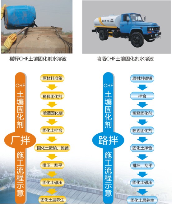 CHF土壤固化劑的使用方法是將CHF土壤固化劑溶液緩緩稀釋于水中,根據土壤的含水率,按一定體積比確定,釋稀比例一般在1:100~1:200;再將稀釋好的CHF土壤固化劑水溶液噴灑于土壤中,并邊噴灑邊進行拌合均勻。根據施工藝可分為廠拌法和路拌法。