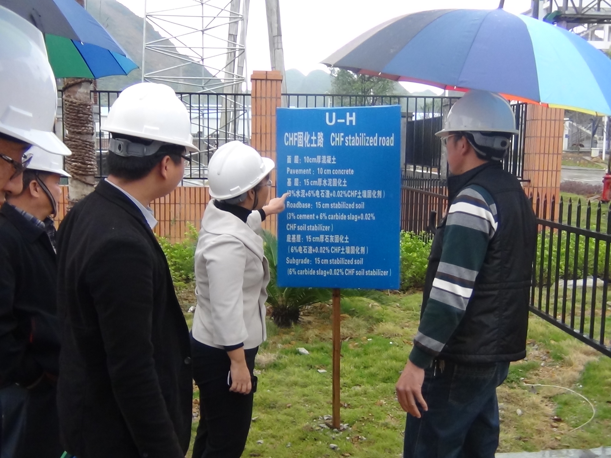市住建委相關領導首先到我公司的展廳了解由我公司自主研發生產的CHF土壤固化劑產品情況,然后參觀了采用CHF土壤固化劑鋪筑的廠區道路、二期地護坡和樣板道路等,公司俞文琴總工程師在參觀過程中對CHF土壤固化劑施工工藝和施工效果等做介紹。